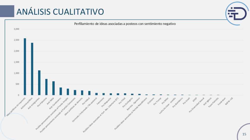 c) En relación al perfilamiento sociológico de las cuentas que postearon con sentimiento negativo hacia el Alcalde, los cinco perfiles dominantes son: i) pensamiento político de izquierda, ii) activismo político (en RR.SS.), iii) anti inmigrantes, iv) pro causa Palestina y v) anti presidente Milei.