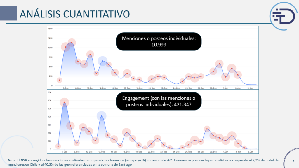 El análisis fue desarrollado entre el 5 de diciembre del 2024 y el 6 de enero del 2025 sobre un total cercano a 4.400 publicaciones en distintos sitios web y redes sociales, sobre un total de menciones circulantes de 61.600. Para llegar a una cantidad realista de manejo que permita una clasificación y perfilamiento conducido por personas (sin apoyo IA), se efectuó un filtraje para cuentas georreferenciadas en la comuna de Santiago. La muestra procesada por analistas corresponde al 7,2% del total de menciones en Chile y al 40,3% de las georreferenciadas en la comuna de Santiago.