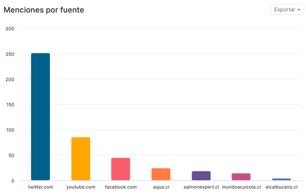En base a los filtros aplicados, y el orden de volumen detectado, las principales fuentes de aparición de noticias y comentarios de la industria fueron: X.com (48%), YouTube (16%), Facebook (8%), aqua.cl (5%), salmonexpert.cl (4%), mundoacuicola.cl (3%), elcalbucano.cl (1%), Instagram.com (1%), TikTok.com (1%) y lavozdevalpo.cl (1%), con un total de 522 menciones relevantes.